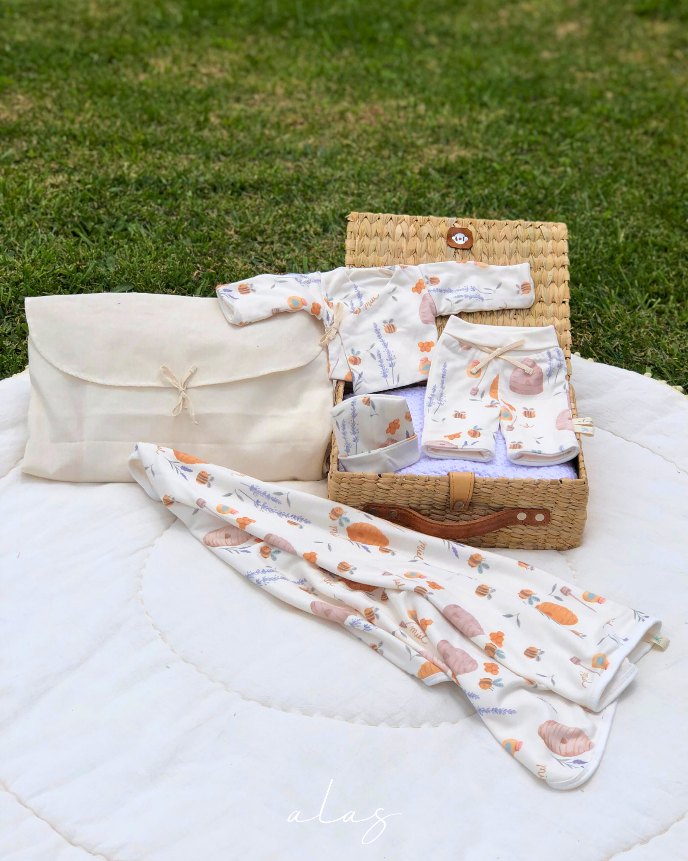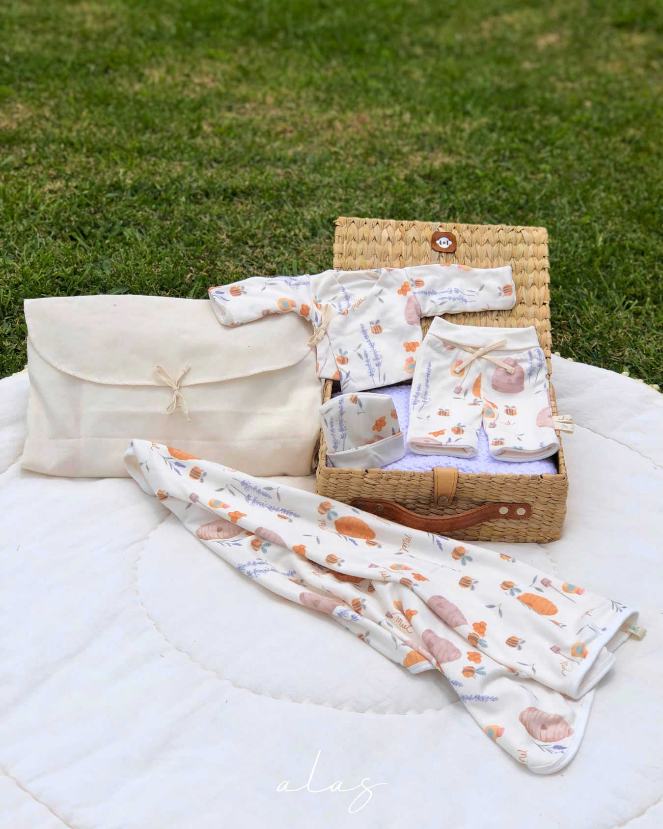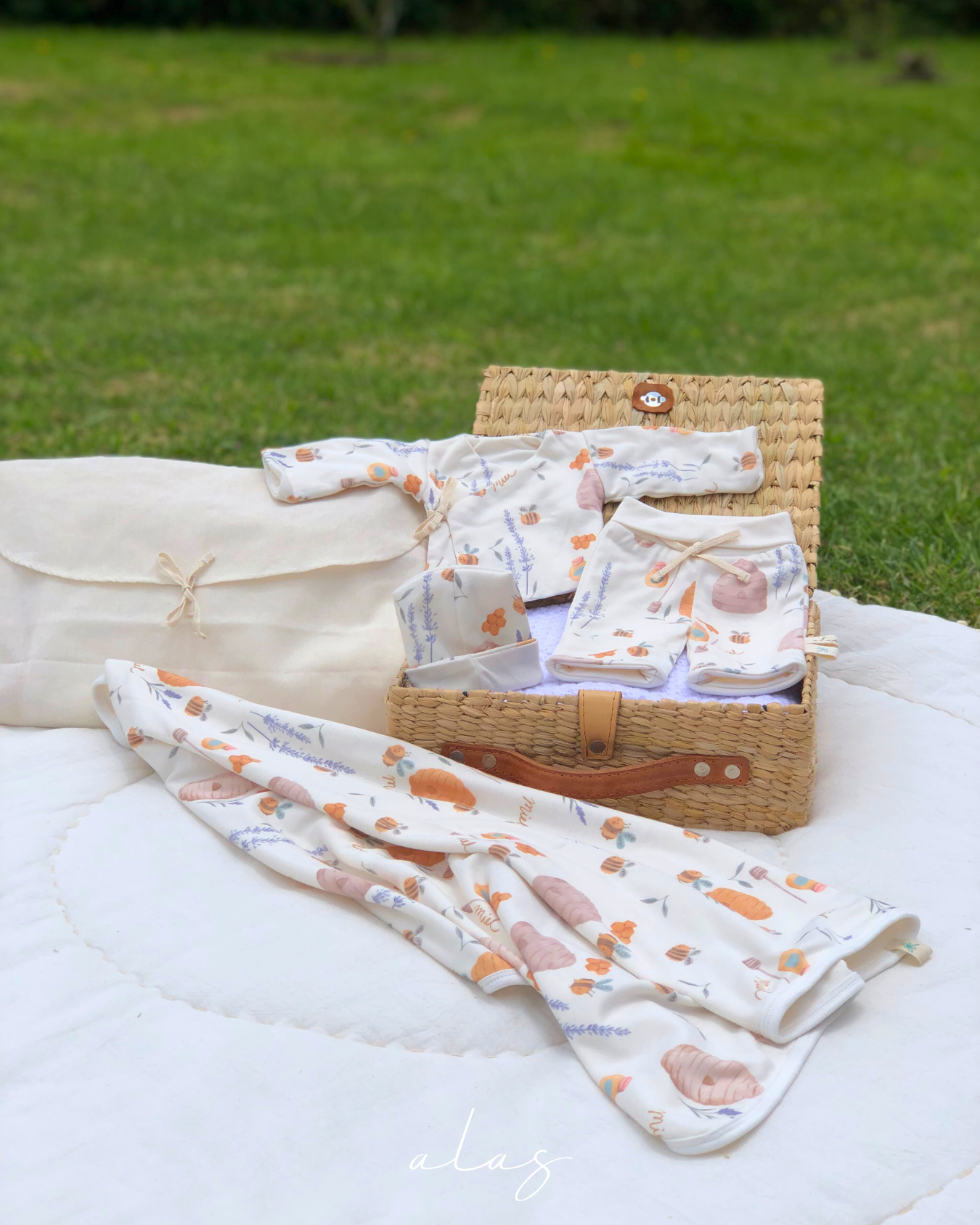 Porque cada comienzo merece un abrazo lleno de amor, nuestro set de Primera Muda esta diseñado para darle al bebé una cálida bienvenida al mundo exterior. Cada prenda y accesorio ha sido creado en doble capa de algodón, suave, transpirable y seguro para la piel del recién nacido.  Incluye: