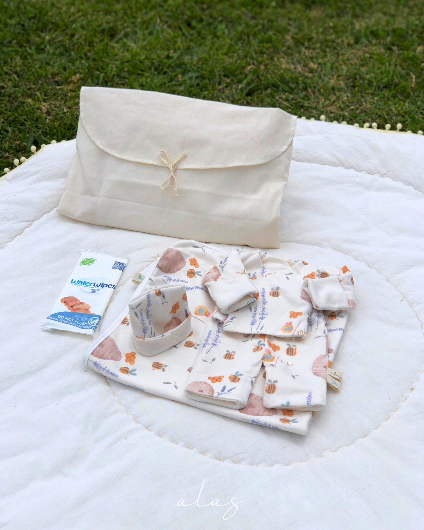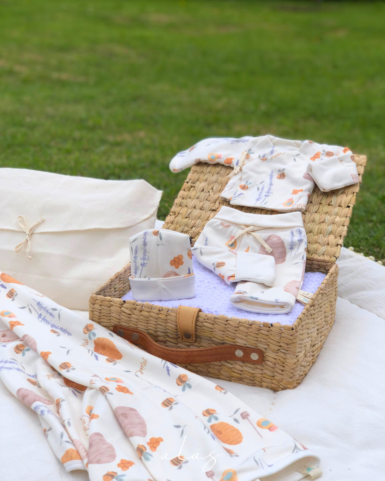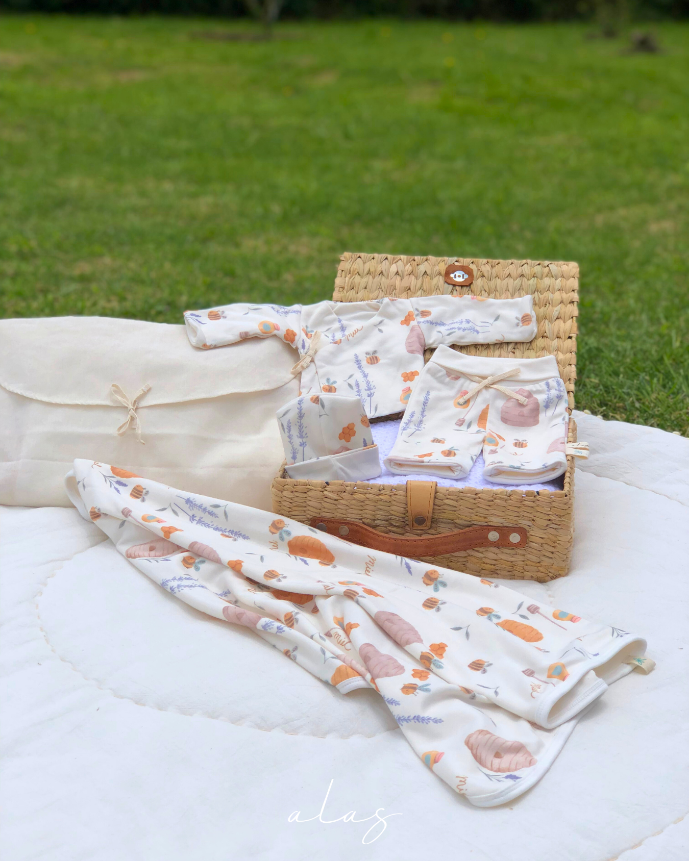 Porque cada comienzo merece un abrazo lleno de amor, nuestro set de Primera Muda esta diseñado para darle al bebé una cálida bienvenida al mundo exterior. Cada prenda y accesorio ha sido creado en doble capa de algodón, suave, transpirable y seguro para la piel del recién nacido.  Incluye: